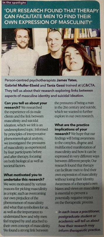 The above LC&CTA students’ Research was published in September 2023 by the bacp in its magazine Therapy Today – we appreciate our students hard work and their contribution to the empirical knowledge base of our profession.